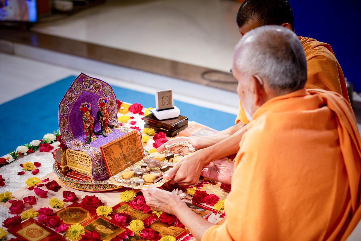 Offering the food to Bhagwan Swaminarayan and singing the thāl sanctifies the food. This sanctified food is known as prasād. By physical acceptance of the prasād we are accepting Bhagwan’s grace and this leads to spiritual joy beyond the physical nourishment or taste provided by the food itself.