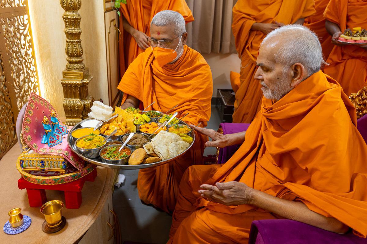 Once, Sadguru Bhumanand Swami did not get anything to eat for four days. On the fifth day, he arrived at a village. A sadhu offered him some green wheat grains (ponk) and Bhumanand Swami was overjoyed. He first offered the green wheat to Bhagwan Swaminarayan as a means of gratitude. Being a poet, words flowed spontaneously from his lips, ‘Jamo thāl jivan jāu vāri…’. Bhagwan Swaminarayan gave him darshan, consumed the food items mentioned in the thāl, and consoled Bhumanand Swami.